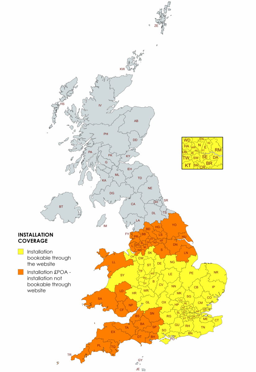 Please note we do not offer installation in the following areas: Northern Ireland, Shetland Islands, Orkney islands, Isle of Man, Outer Hebrides in Scotland or Guernsey.